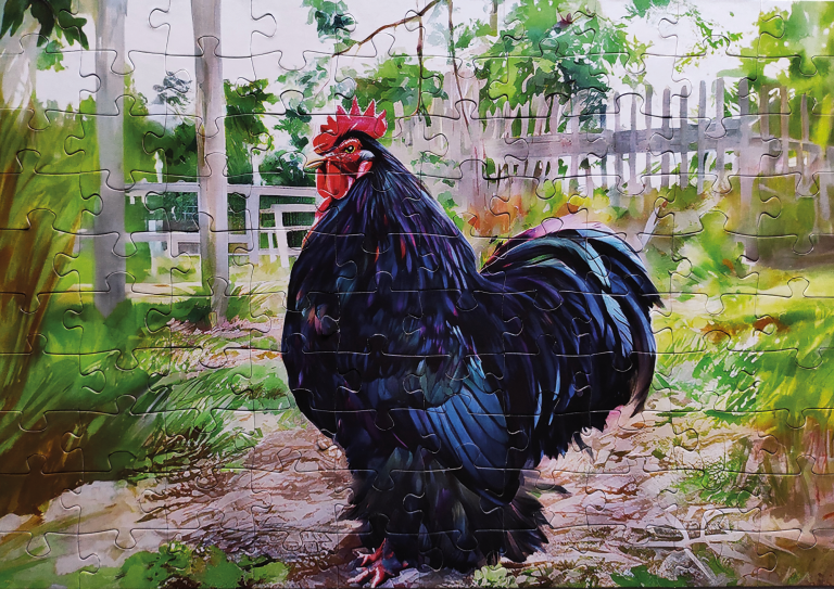 DESIGN: Das Motiv zeigt einen prächtigen Hahn in einer idyllischen Gartenlandschaft, dessen Details sich Stück für Stück zusammenfügen lassen.